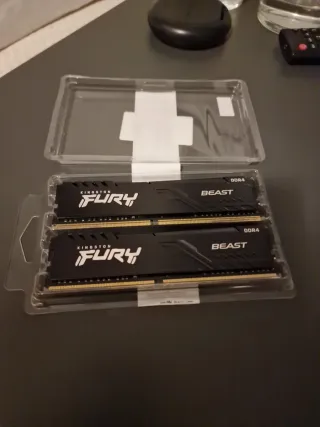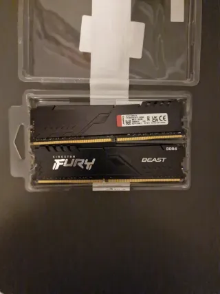 Dos módulos de memoria RAM Kingston FURY Beast DDR4. Usadas 2 veces contadas. 8 GB por módulo. - Diseño en color negro. - Etiqueta con el logo de Kingston FURY. - Indicación DDR4 en la parte superior.