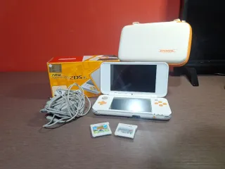 Consola portátil New Nintendo 2DS XL en color blanco y naranja - Incluye el juego Animal Crossing New Leaf Welcome amiibo y Mario Kart 7 - cuenta con funda del mismo color que la nintendo y un boli tactil - viene con cargador y caja - la nintendo cuenta con proteccion de pantalla y carcasa ( la consola esta de fabrica y sin modificar )