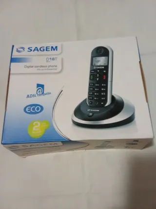 Teléfono inalámbrico Sagem D16T, un modelo digital con diseño moderno. - Compatible con ADSL. - Función ECO para un menor consumo. - Incluye base de carga.