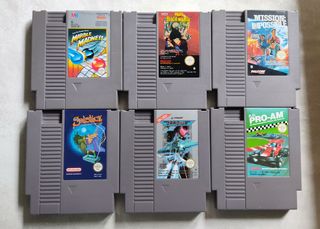 Lote de 6 videojuegos para Nintendo Entertainment System (NES), todos PAL B funcionando bien, todos en perfecto estado a menos que se indique (precios por separado en mi usuario): - Marble Madness (fra) - Wrath of the Black Manta (fra, con detalle en pegatina trasera) - Mission: Impossible (esp) - Solstice (esp) - Gradius (eec) - R.C. Pro-Am (esp)