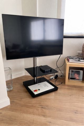 Soporte de pie para televisión con diseño moderno y funcional. - Base y estantes de cristal negro. - Columna central metálica. - Altura ajustable y articulable (derecha e izquierda)