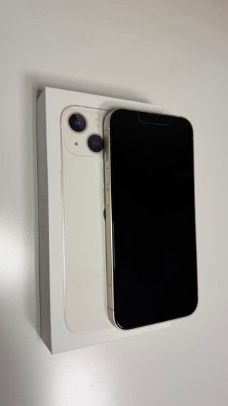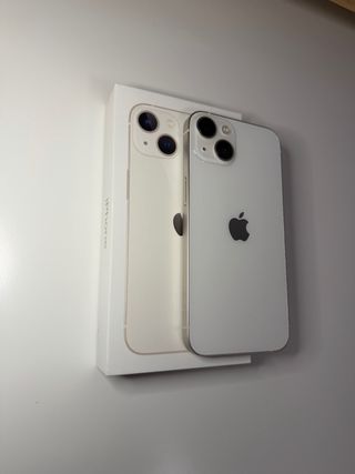 Se vende móvil iPhone 13 en color blanco, de 128 gb con 96% de salud de batería. Tiene incorporado un protector de pantalla. Incluye: - Cable para cargar - 4 fundas del movil - 2 protectores de cámara