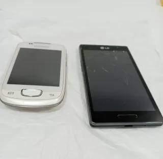 Se vende lote de dos teléfonos móviles, uno de la marca LG y otro de Samsung. Sin cables. - Teléfono móvil LG -P760 en color negro. 2012. Pantalla rota pero funciona. - Teléfono móvil Samsung Galaxy mini Gt-S5570 del 2011 en color blanco. Se pueden vender separados a 6€ el blanco y a 3€ el negro.