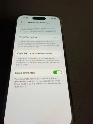 iPhone 14 Pro con 128GB de almacenamiento. - Capacidad máxima de batería del 81%. - Carga optimizada activada para el cuidado de la batería.