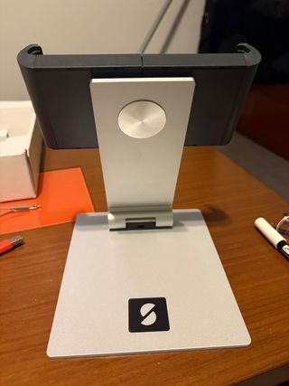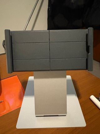 Este soporte adaptable es ideal para diversos usos. Su diseño moderno se integra fácilmente en cualquier espacio. - Color gris oscuro. - Base blanca. - Material resistente.