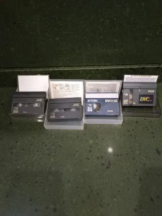 Conjunto de cuatro cintas de vídeo MiniDV, cada una con una capacidad de 60 minutos. Lote 4 cintas videocámara miniDV 60 min Desprecintado regrabables infinitamente. 2 JVC miniDV 60min 1 FUJI miniDV 60min 1 TDK miniDV 60 min - Incluye cintas de las marcas JVC, TDK y Fuji. - Formato MiniDV para grabaciones de alta calidad.