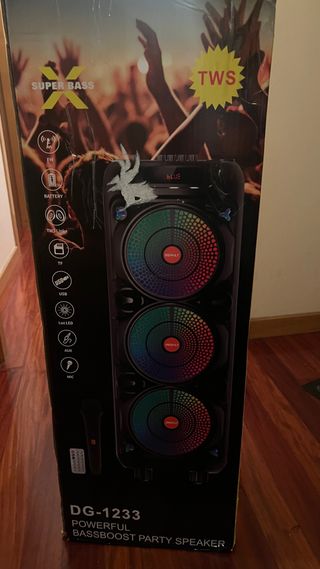 Altavoz potente DG-1233 con función Super Bass y TWS Link. - Potencia de 40W. - Conexiones: FM, Tarjeta TF, USB, AUX. - Incluye micrófono y mando a distancia. - Luces LED integradas.