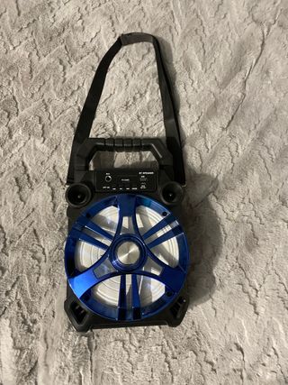 Altavoz portátil con un diseño moderno y llamativo. - Color principal negro con detalles en azul. - Asa para facilitar su transporte. - Conexión Bluetooth para escuchar tu música sin cables.
