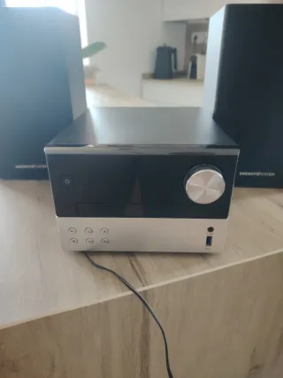 Equipo de sonido con un diseño moderno y elegante. Tiene bluetooth también para reproducir música desde el móvil - Altavoces de color negro. - Unidad central con acabado plateado y negro. - Botón de control circular.