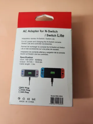 Adaptador de corriente para Nintendo Switch y Switch Lite. - Voltaje de entrada: 100-240V. - Frecuencia: 50/60Hz. - Salida: 5V/1.5A o 15V/2.6A. - Longitud del cable: 1.5m. - Incluye enchufe EU, USA y UK.