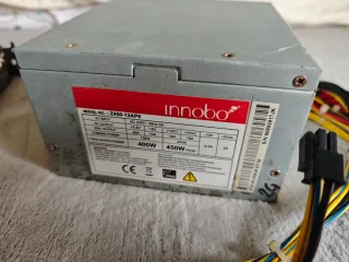 Fuente de alimentación para PC de la marca Innobo, modelo Z450-12AP6. - Potencia total de 400W (450W pico). - Entrada AC: 230V~50Hz 5A. - Salida DC: +3.3V (20A), +5V (14A), +12V1 (19A), +12V2 (19A), -12V (0.3A), +5Vsb (2A). - Potencia combinada: 130W.