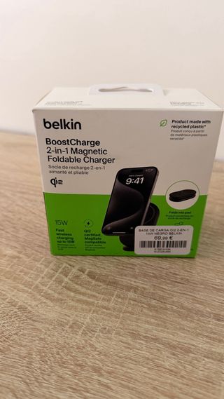 Nuevo sin abrir, cargador magnético plegable Belkin BoostCharge 2 en 1. Sirve para cargar el móvil y auriculares al mismo tiempo. Precio en tienda: 70€ - Carga inalámbrica rápida de hasta 15W. - Certificado Qi2 y compatible con MagSafe. - Diseño plegable para facilitar el transporte.