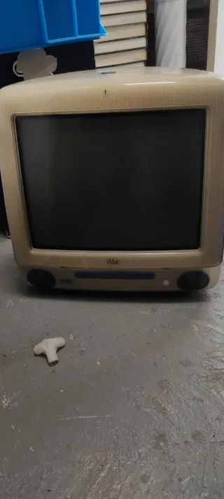 Monitor iMac de Apple en color beige, con un diseño retro icónico. - Pantalla de tubo. - Altavoces integrados en la parte frontal. - Puerto de CD/DVD en la parte frontal.