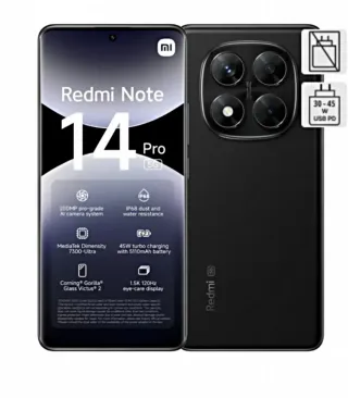 Teléfono móvil Redmi Note 14 Pro 5G en color negro y con 512GB de almacenamiento. - Pantalla de 1.5K con 120Hz y tecnología eye-care. - Cámara principal de 200MP con sistema IA. - Resistencia al polvo y agua IP68. - Procesador MediaTek Dimensity 7300-Ultra. - Batería de 5110mAh con carga turbo de 45W. - Cristal Corning Gorilla Glass Victus 2.