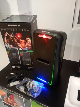 Altavoz inalámbrico con batería, ideal para fiestas y eventos. - Conexión Bluetooth.radio fm, lector tarjetas y usb - Luces LED multicolores. - Incluye micrófono, mando a distancia cable mini Jack y cable de carga. Está sin usar, nuevo, el altavoz mide 50cm x 25cm aprox