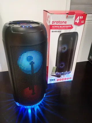 Altavoz inalámbrico con luces LED y control remoto. - Modelo SHR130. - Conexión Bluetooth.radio fm lector tarjetas y usb - Luces LED multicolor. - Incluye control remoto y micrófono Medidas 40cm x 18cm aprox