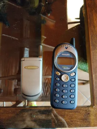 Se venden dos teléfonos móviles clásicos, uno de Motorola y otro de Philips. - Teléfono móvil Motorola plateado. - Teléfono móvil Philips azul.