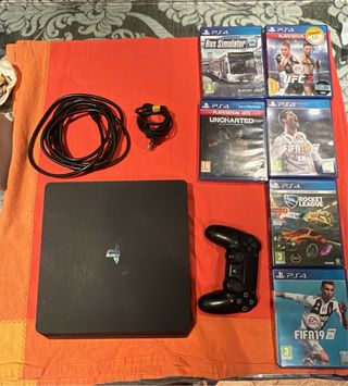 Consola PlayStation 4 en color negro, junto con siete videojuegos, para piezas mayormente, la ps4 enciende, funciona, pero los discos le cuesta entrar, si sois capaces de arreglar lo del disco teneis la ps4 nueva , la pongo tb con un volante PODEIS COMPRAR TODO JUNTO (PS4+ Juegos+Volante) o (Volante solo) o (volante +juegos) etc... pregunten, pero no mareeis, urge venga - Bus Simulator - UFC 2 - Uncharted - FIFA 18 - Rocket League - FIFA 19 - Gta 5