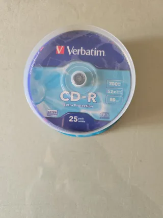 Pack de 25 discos CD-R Verbatim con protección extra. - Capacidad de 700 MB. - Velocidad de grabación de 52x. - Tiempo de grabación de 80 minutos.