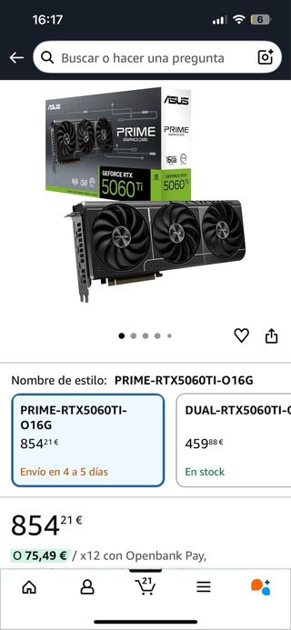 Tarjeta gráfica ASUS Prime GeForce RTX 5060 Ti con 16GB de memoria GDDR6. - Edición OC. - Soporte PCIe 5.0. - Compatible con DLSS, Ray Tracing, Reflex y Studio. Solo lo he usaso 1 mes y con un uso bastante poco, solo fortnite r coket leagje