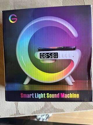 Lámpara con cargador inalámbrico incorporado, con un diseño moderno y elegante. - Base con carga inalámbrica. - Luz LED con gradiente de colores. - Pantalla digital con hora.