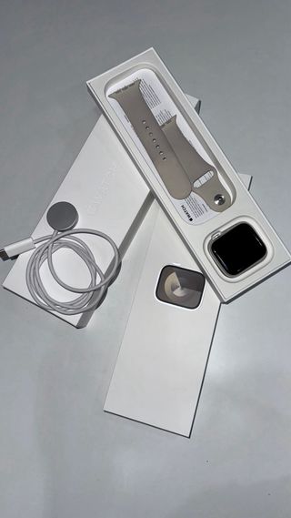 Apple Watch Series 9 de 45mm en color plata. La pantalla muestra el estado de la batería. - Capacidad máxima de la batería: 99% -Caja + cargador originales -Incluye 2 correas más.