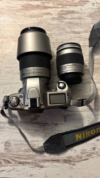 Se vende kit de cámara fotográfica Nikon F65 Incluye -Objetivo 70-300mm - Objetivo 28-80mm - Correa para colgar -Bolsa porta camara
