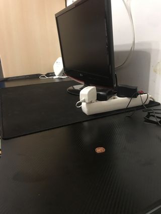 Mesa versátil, perfecta para gaming o estudio. Combina materiales y colores para un estilo moderno. - Estructura metálica robusta. - Superficie de madera con acabado imitación carbono. - Patas de metal negro.