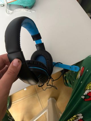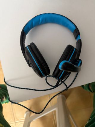 Cascos para gaming con diadema ajustable y almohadillas cómodas. - Diseño en color negro con detalles en azul. - Cable trenzado con patrón de puntos azules y negros.