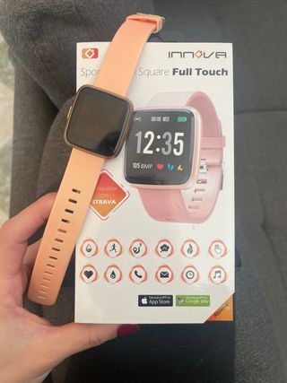 Reloj inteligente casi sin uso. En las fotografias se encuentra la descripcion de todos sus modos y caracteristicas (calorias, pasos, deportes, notificaciones, sueño, oxigeno, cronometro, fecha y hora...). En perfecto estado. App funDo. color rosa, no sumergible. marca innova. sportwatch