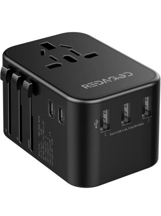Adaptador de viaje universal de la marca REDAGOD. Permite conectar tus dispositivos en diferentes países. - Múltiples tipos de enchufes integrados (EU, UK, USA/AUS). - Puertos USB-C y USB-A para carga. - Indicación de potencia máxima y fusibles.