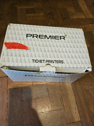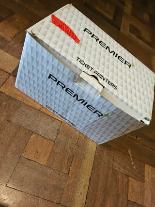 Caja de impresora de tickets PREMIER. - Diseño con patrón de rombos. - Etiqueta de seguridad roja.
