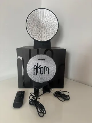 Altavoz Akorn con un diseño moderno y elegante. - Altavoz circular con rejilla perforada. - Base negra. - Incluye mando a distancia. - Incluye cable de audio 3.5mm. - Incluye adaptador de corriente.