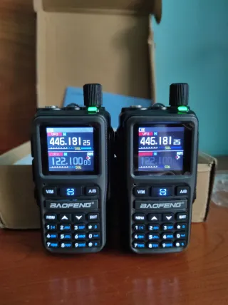Pareja de emisoras bibanda UHF VHF más banda aérea, muy pequeños y compactos pero con multitud de funciones como, doble ptt, programación a través de PC, bluetooth y por aproximación de otro transmisor, memoria de hasta 999 canales, carga a través de puerto USB tipo C. Pantalla a color de buen tamaño y visibilidad. Batería litio alta capacidad. SE ENTREGAN PROGRAMADOS CON LOS CANALES PMR LIBRES DE LICENCIA. -EN EQUIPOS RF DE ELECTRÓNICA, NO SE ACEPTAN DEVOLUCIONES POR UN POSIBLE USO NEGLIGENTE DEL MISMO. PUEDO MANDAR VIDEOS POR WHATSAPP PARA CORROBORAR SU PERFECTO FUNCIONAMIENTO.