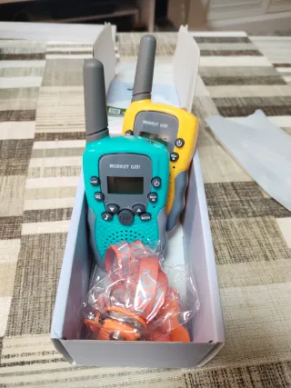 Par de walkie talkies. Están sin usar, con la caja y las instrucciones originales. Es un regalo perfecto para los más peques, son muy entretenidos e intuitivos. Esta garantizado su funcionamiento. - Alcance de hasta 6 km. - Función "VOX" para manos libres. - 0.5 W. - 8 canales de banda estrecha. - Multitud de tonos. - Linterna incorporada. Cada walkie talkie necesita tres pilas AAA. ¿Qué se incluye en el paquete? - Dos walkie talkies - Manual de instrucciones - 6 pilas AAA