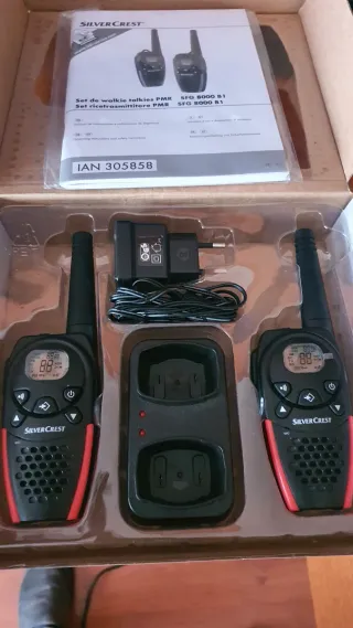 Set de dos walkie talkies SilverCrest SFG 8000 B1. 8 kilómetros de distancia. - Incluye dos walkie talkies. - Base de carga doble. - Adaptador de corriente. - 6 baterías recargables Nuevos. No las he ha usado. Funcionan perfectamente. No leer. Sofás , Somier, litera, cabezal, estantEs madera de teka y es forja?ería, librería, zapatero, mesa, sillas, comedor salón, dormitorio, nevera, congelador, lavadora, secadora, lavavajillas, microonda, habitacion, armario, nido, canapes, somier, colchon, vitrina, sillon relax, motos, piano, escritorio. cocina
