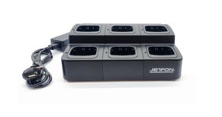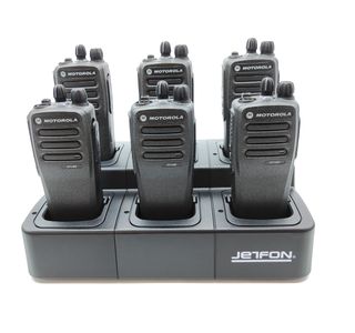 JETFON MULTI M-1400 CARGADOR MÚLTIPLE WALKIES MOTOROLA DP1400 Y CP040 Cargador múltiple Walkies Motorola El Jetfon Multi M-1400 es un cargador múltiple de 6 unidades para Walkie-talkies Motorola DP1400 y CP040, entre otros* que le permite cargar 6 Walkies a la vez mediante una sola toma de enchufe, reduciendo el espacio y los cables en su lugar de trabajo. Permite además, cargar las baterías directamente sin los Walkies, de modo que podemos tener una segunda batería en carga mientras estamos usando el Walkie. El cargador múltiple está preparado para montaje en la pared con tres puntos de soporte. SOMOS TIENDA