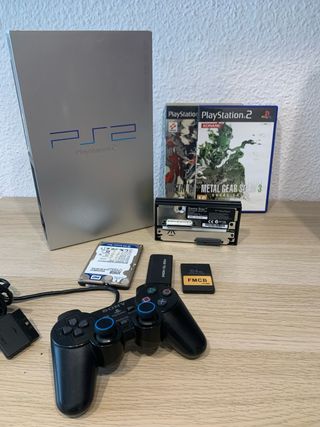 Consola PlayStation 2 modelo Fat en color plata. Incluye cables y adaptador para hdmi - Mando. - Disco duro interno. - Tarjeta de memoria FMCB 64MB. - Adaptador Free McBoot para puerto de memoria. - Juego Metal Gear Solid 2 y 3