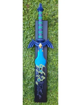 DH0492#71. Réplica de la Espada Maestra de Zelda del famoso juego Tears of the Kingdom. Hoja de 33 cmde largo y 3,3 mm de grosor fabricada en acero y acabada en azul. El mango está hecho en acero con acabados azules y trenzado de polipiel verde. Incluye soporte de sobremesa de madera. El tamaño total es de 62 cm de largo. Pesa 970 gr.