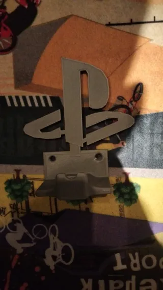 Este es un logo de PlayStation. - Color gris. - Diseño icónico.