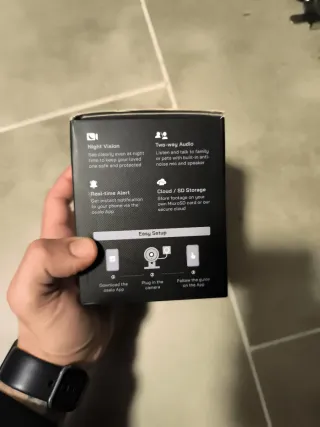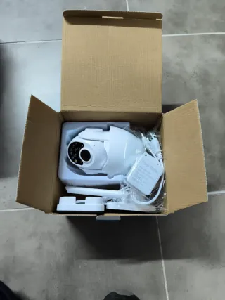 Cámara de seguridad blanca, ideal para interiores. Se encuentra en su caja original. - Incluye adaptador de corriente. - Soporte de montaje.