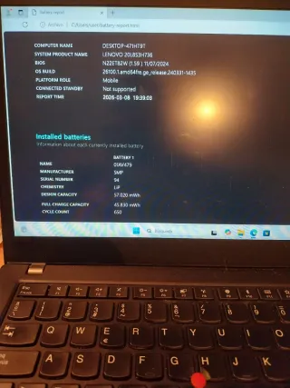 Portátil Lenovo Thinkpad T490S en color negro. Un equipo ligero y potente para el día a día. - Pantalla de 14 pulgadas. - Teclado retroiluminado. - Lector de huellas dactilares. - Memoria RAM 8 Gb - Disco duro 238Gb Características he informe de batería en las fotos