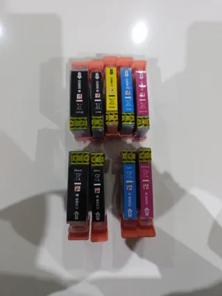 Lote de 9 cartuchos de tinta compatibles para impresora. - Cartucho C005 B (Negro) - Cartucho C008 B (Negro) - Cartucho C008 C (Cyan) - Cartucho C008 M (Magenta) - Cartucho C008 Y ( Amarillo) Falta un cartucho amarillo porque es el que utilice para colocarlo en la impresora, pero no entra en el alojamiento porque me equivoqué al pedirlo. Están en su embalaje, son compatibles no originales.
