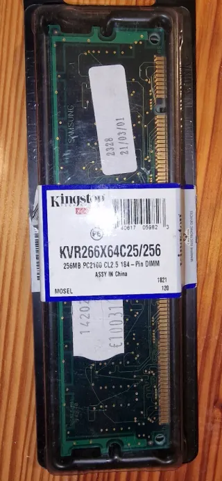 Módulo de memoria RAM Kingston Value RAM. - Modelo: KVR266X64C25/256 - Capacidad: 256MB - Tipo: PC2100 CL2.5 - Conector: 184-Pin DIMM - Fabricado en China