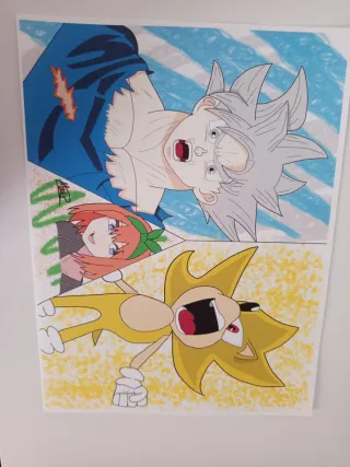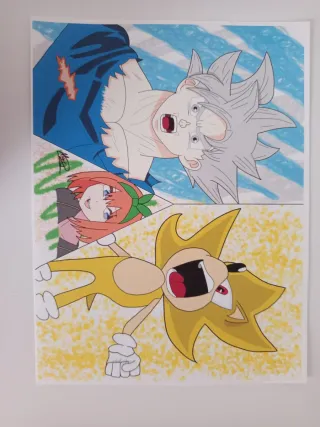 Dibujo original realizado por mí, con los personajes Goku (Ultra Instinto), Sonic (Super Sonic) y Yotsuba. - Goku con su traje azul rasgado. - Sonic en su versión Super Sonic. - Yotsuba con su característico lazo verde.