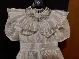 Vestido de comunión con un diseño elegante y detallado. - Cuerpo de encaje con cuello redondo. - Mangas cortas abullonadas con volantes. - Cinturón con detalles de perlas. - Falda con múltiples volantes y encaje. - Adorno de perlas en la parte delantera.