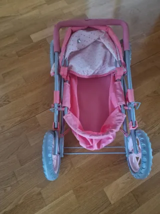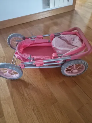 Carro de juguete para muñecas, de color rosa. - Estructura metálica. - Ruedas de plástico. - Tejido con estampado de puntos.