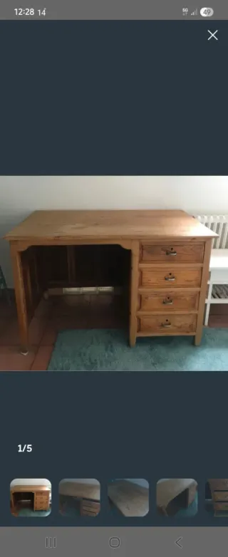 Precioso escritorio antiguo con un diseño clásico y elegante. - Fabricado en madera maciza. - Cuenta con varios cajones para almacenamiento. - Acabado en tono natural de la madera. Medidas 124 largo 70 ancho 80 alto
