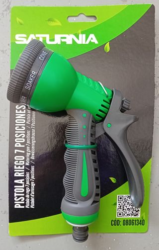 Set compuesto por: - 1 Pistola riego manguera 7 posiciones: Realizada en plástico ABS Con selector de 7 posiciones de salida de agua; Ducha, a presión, nebulizado, chorro, cono, centrado o plano. Conector rápido compatible con los conectores de las mangueras. Mango ergonómico y con relieves para una mayor comodidad y sujeción. Caudal ajustable. - 2 Conectores de manguera 1/2, apto para mangueras de 15 a 20mm diámetro exterior.
