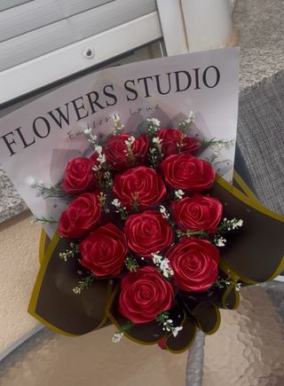 Elegante ramo de rosas hechas de tela satinada, perfectas para un detalle duradero. - Flores de tela satinada. - Color rojo intenso. - Base de envoltorio en tonos marrones y dorados.